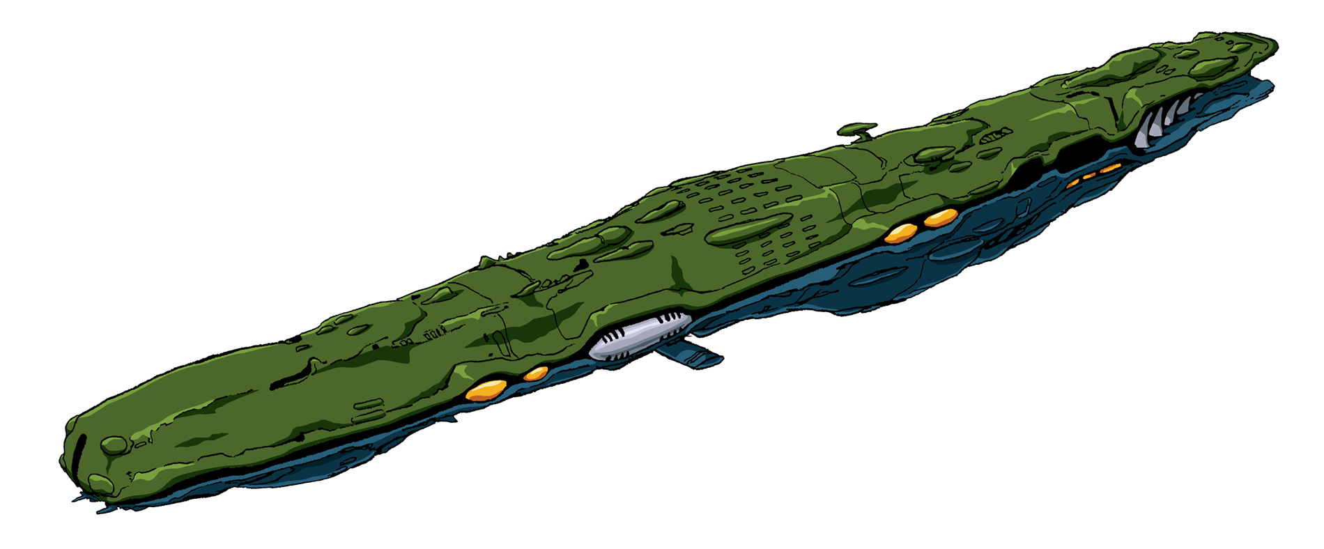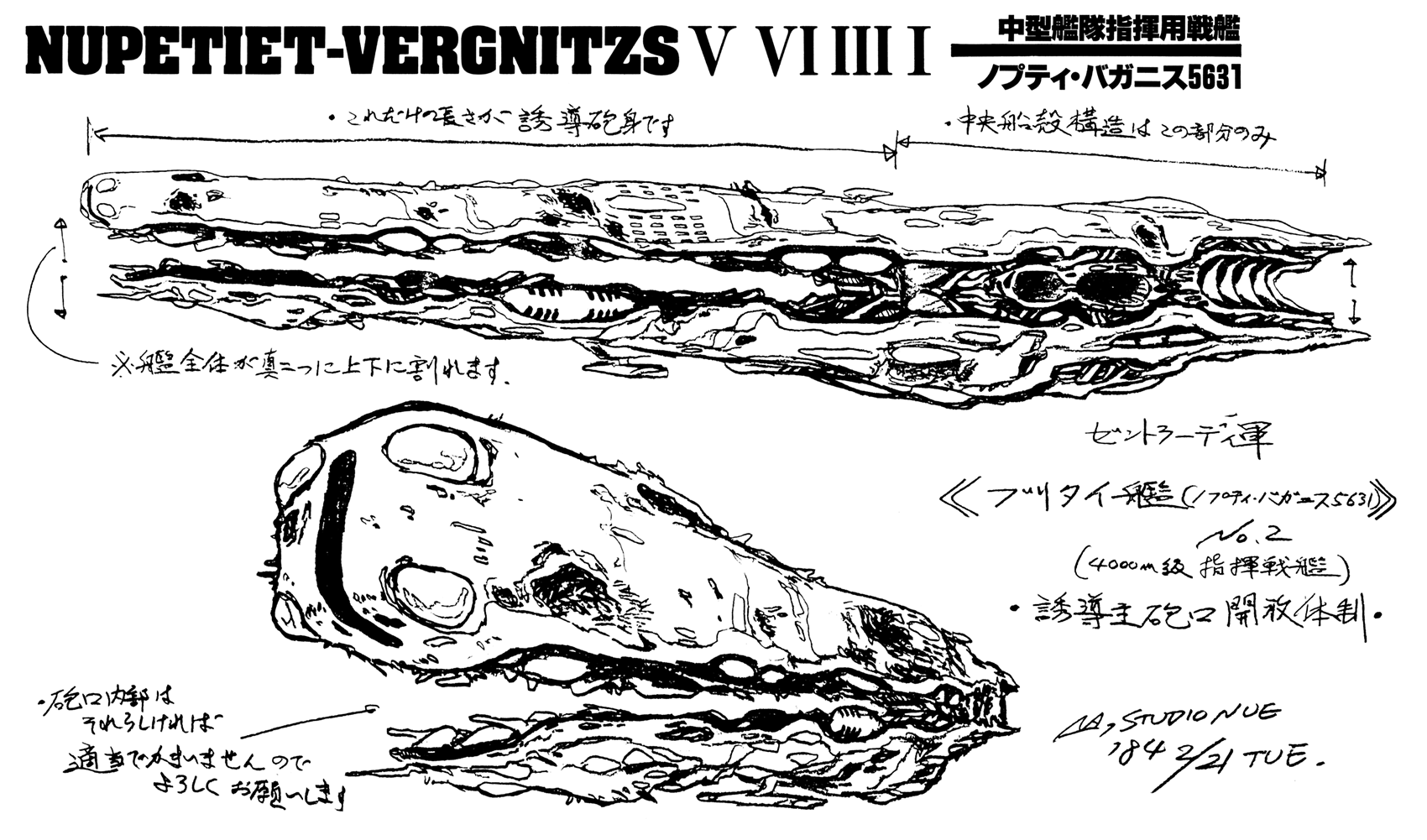 Nearly identical to the television series version, the Nupetiet Vergnitzs Class Fleet Command Battleship is featured with a slightly different color scheme in the film Do You Remember Love?. The other significant difference seen in the film version of the Battleship is a ship-length heavy converging beam cannon similar to the Medium-Scale Gun Destroyer. The Nupetiet Vergnitzs main gun activates by lifting the dorsal hull and dropping the ventral hull (nearly opening the entire ship from stem to stern) and thus acts as a collimator for super dimension energy to collect and fire forward. In Space War I, Commander Britai used this powerful weapon to blast a large hole through the hull of the Gol Boddole Zer Mobile Fortress, allowing the SDF-1 Macross to fly into the ship and attack Gol Boddole Zer directly.