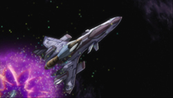 NOTE: Fans often discuss this unknown craft, noting it resembles the VF-2SS Valkyrie II (from Macross II: Lovers Again) or comparing it to the VF-4 Lightning III, the VF-5000 Star Mirage, or the VF-11 Thunderbolt. Examining screenshots from the Macross Frontier series makes clear the craft is not a pre-existing class but rather a different design as yet unidentified. There is no official information published about this craft to date, only that it shares the style of a variable craft yet not any specific design that can be definitively identified. This space craft does not appear in any Macross Frontier book and is only mentioned via a screen shot in the Macross Chronicle. The craft appears to be a throwaway design required only as a one-time use for purposes of the plot of episode 5. Or it could possibly be a reference to the 1992 animated OVA Macross II: Lovers Again, a part of the theme in the Macross Frontier series that celebrates all the Macross stories of the past 25 years.