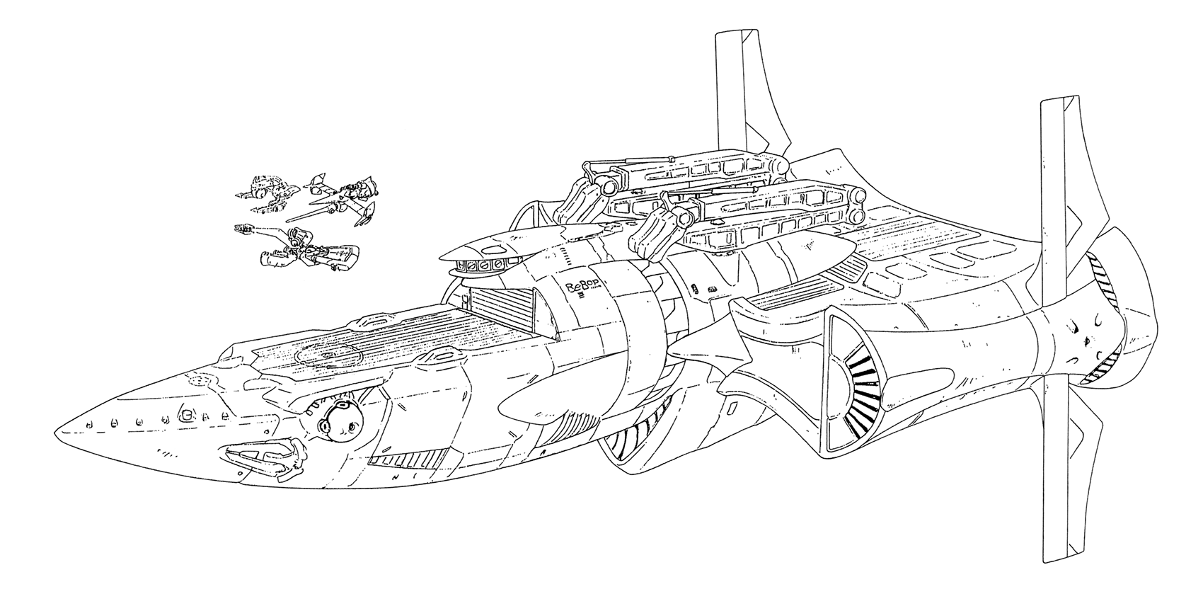 Design Features: forward hangar bay (dorsal section amidships, under main bridge); rotational gravity centrifuge (amidships); rear cargo dome door (center aft dorsal section); internal cargo bays and refrigeration systems; MONO computer