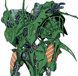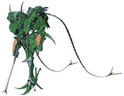 The massive Jagd Mirage represents the pinnacle of Mortar Headd technological achievement within the Amaterasu Kingdom Demesnes and was the most devastating weapon designed by Mortar Headd meight Amaterasu no Mikado. A monster among giants, the "Green Demon" is a truly enormous war machine standing almost three times as high as the average 15-meter-tall Mortar Headd. Ensuring combat performance of such a large machine necessitated building a skeletonized frame, a frame that is functional but bestows upon the Jagd Mirage a rather emaciated appearance. The Green Demon's armor is only marginally thicker than a standard Mortar Headd, resulting in a Mirage not that much more difficult to damage than any other Mortar Headd. These design compromises allow the Jagd Mirage to move as swiftly and become as deadly as the best Mortar Headds even in spite of its gigantic stature.