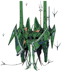 Design Features: 2 x stabilizers (long and tail-like, mounted left/right upon the top rear torso); 2 x plasma and many x electronic computers (data processing equipment); 2 x device compressors; 2 x function sequencers; 8 x function generators; 16 x drive motors; 4 x source expanders; 4 x regenerators; 108 limiter gate samplers; 4 x ezlaser function rocket motors; 36 x 16 reverberators; beacon and laser communications; complex drive train system including gas/oil/hydraulic power, gears, pistons, actuators and cables; generator-use air barrier & air buster; fully coordinated human operated analogue control system; electroencephalo HMI helmet