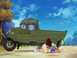 The Amphibious Rickshaw (also called Amphibious Three-Wheeled Vehicle) is a wheeled land and water use automobile operated by the indigenous people of the Planet Zola. Despite the limited technology employed by the Zolans, the Amphibious Rickshaw is a robust vehicle capable of carrying roughly 8-9 people within the rear cargo bed and the cab can accomodate additional passengers. When operating in the water, the vehicle deploys propellers for propulsion and utilizes a rear-mounted rudder for maneuvering. The Amphibious Rickshaw has a maximum road speed of about 30 kilometers per hour (19 miles per hour). Nekki Basara travelled as a passenger in an amphibious rickshaw operated by Elma Hoyly when he visited the Planet Zola in 2047.