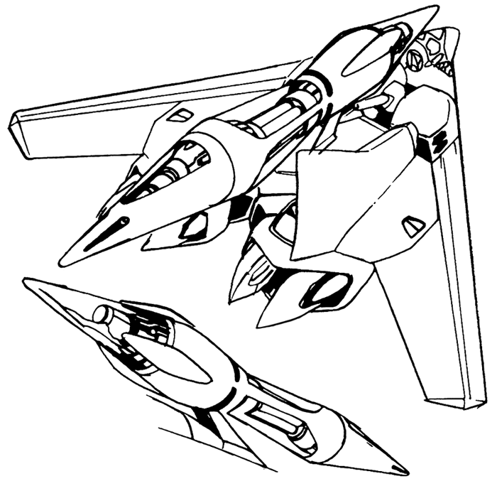 Design Features: 3-mode variable transformation; vertical take-off and landing (VTOL); variable geometry sweep (VG) wing (featuring sawtooth delta wing in standard cruising configuration); wrap-around imaging monitor screens (for use in Heavy Battroid mode); passive stealth system; two-dimensional (horizontal) thrust vectoring; external fold booster and mount (mounted on dorsal fuselage)