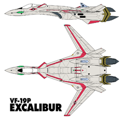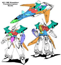 NOTE: The Macross Chronicle (published 2013) and the 1/60 scale VF-19P Excalibur transformable toy produced by Yamato (released 2012) both depict the feet/engines of the VF-19P in a bluish metal color. However, high definition screen captures from the official blu-ray discs for Macross Dynamite 7 (1997) clearly depict the engines in a charcoal grey-black color. Other sources such as Variable Fighter Master File: VF-19 Excalibur (2010) also depict the dark grey/black colored engines/feet. The blue tinted metal may be the official colors, but the Macross Mecha Manual always prioritizes color reproduction of the mecha as they appear in the animation itself. As such, the VF-19P Excalibur will be shown here with the charcoal engines/feet.