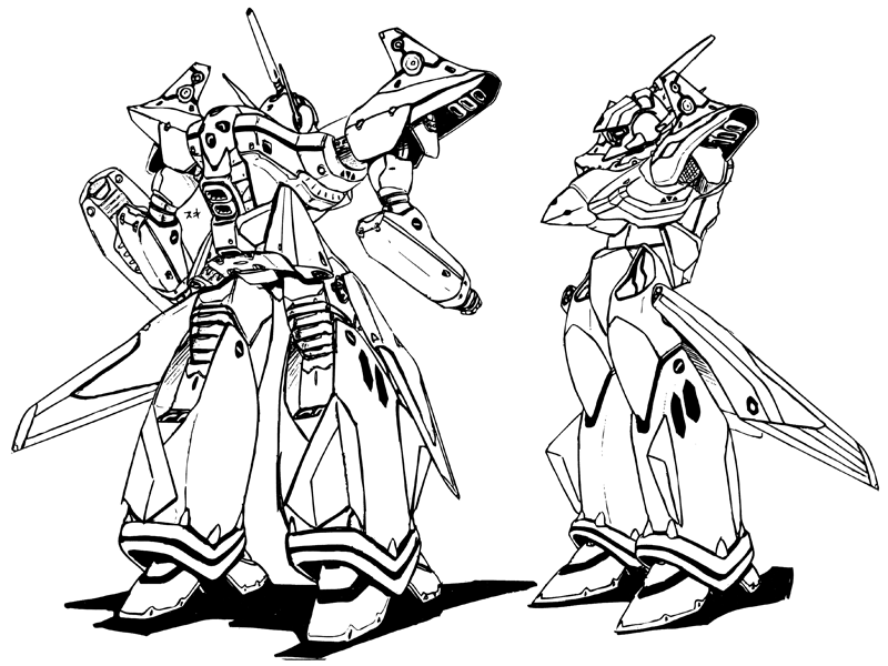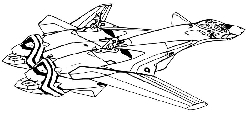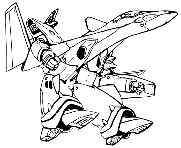 Design Features: 3-mode variable transformation; variable geometry sweep (VG) wing; canard forward wing; vertical take-off and landing (VTOL); supersonic cruise and maneuvering in region of Mach 5.0+ below the stratosphere; two-dimensional thrust vectoring (independent pivot); capable of attaining unassisted orbital velocity over an Earth-class planet; wrap-around imaging monitor system in cockpit (all modes); anti-projectile (bulletproof) shield; internal weapons bays with medium-range high maneuverability missiles (engine/leg sections); fighter-scale pin-point barrier system (allows for armor simplification and light weight); active stealth system; 3 x special equipment hard point stations for optional 2 x space/atmospheric conformal propellant tanks and optional 1 x space/atmospheric fighter fold booster