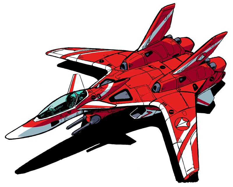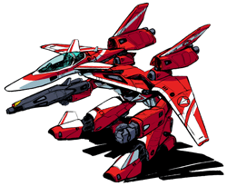 Design Features: 3-mode variable transformation; forward-swept main wing; canard wings; high maneuverability in the Mach 1 regime; beam guns located on the shoulder due to airframe miniaturization and incorporating a variable mechanism on a small aircraft; engine output greater than VF-4; lightweight and power-weight ratio (thrust vs. weight); airframe adopts the relatively safe blended wing body (integrated airframe wing); large-sized hands and legs; main wing and canards fold in a complex manner forming chest armor plate (due to this, it has the nickname "Origami Fighter"); main wing forming the main body armor limits use of underwing equipment