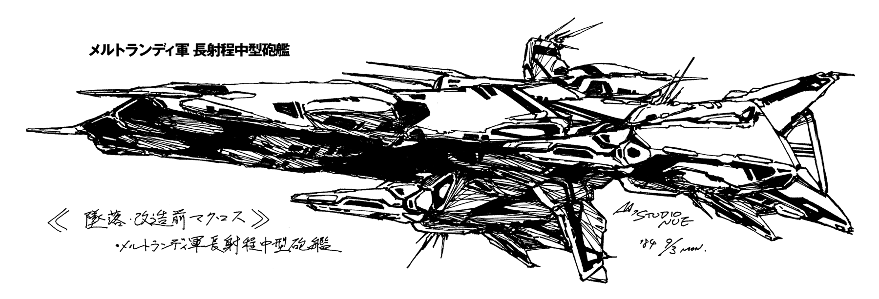 Another vessel that never appeared in the animated movie, the Alien StarShip One was nonetheless redesigned for the film like many of the capital ships in the original television series. In Super Dimension Fortress Macross The Movie: Do You Remember Love? the ASS-1 is a Meltran Gun Destroyer that crashed on Earth in 1999. Rebuilt by humans it becomes the SDF-1 Macross and thus this version of the alien spacecraft is designed to explain the visual differences of the SDF-1 Macross (Film Version) from that of the television series vessel. Just like the original ASS-1 in the television series, very little detail is revealed about the alien ship except that it has the distinct super dimension energy gun common to the most powerful anti-ship/anti-fortification warships.