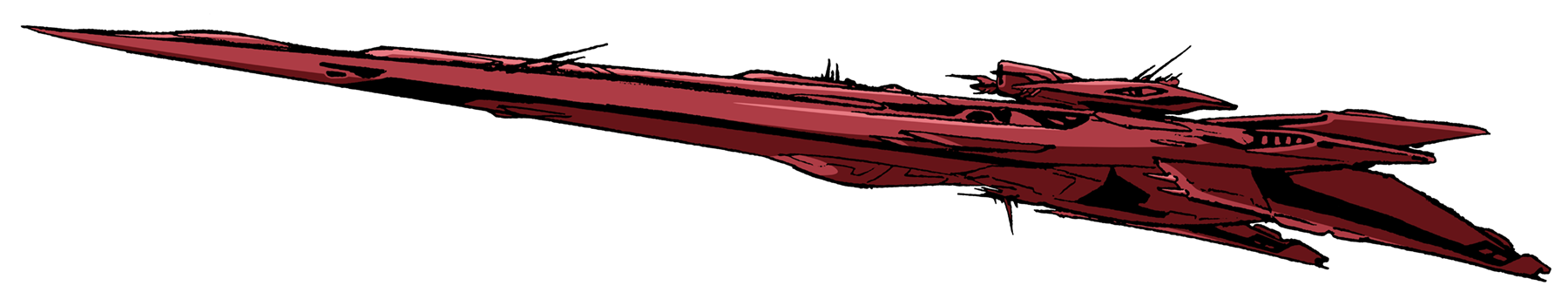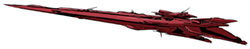 The Large Battleship is the biggest warship in the Meltrandi fleet, with a prominent slender bow that stretches the length of the ship. In contrast to the Standard Battleship (featuring thrusters arranged top to bottom) the Large Battleship features thrusters on the port and starboard, contributing to a broad width. Upon the back dorsal section rests a bridge atop the hull. At 5,000 meters in length, the Large Battleship has a great number of beam guns and missiles.