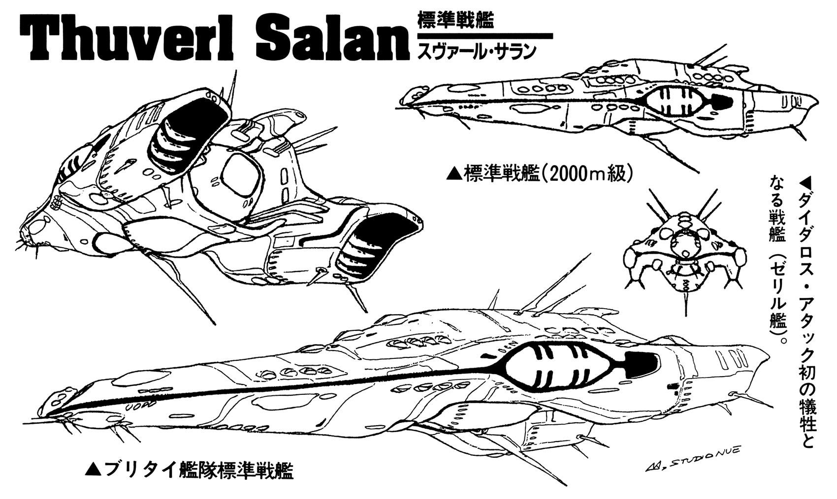 The familiar backbone of the Zentradi Fleet, the Thuverl-Salan Class Battleship appears nearly the same in the film as it does in the television series. The only difference is three red colored turrets along the dorsal center axis of the ship.