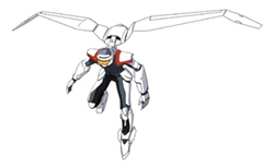 Civilian Version: powered hands and legs differ from military-use; inner suit is exposed more compared to military version; flight pack and survival kit are lighter than military version but basic function is similar; ExSuitcase for EX-Gear storage and transport with security command panel on the case side; motor glider-type flight unit for high-performance flight similar to military version but of a different design; three-stage folding wings