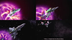 NOTE: Fans often discuss this unknown craft, noting it resembles the VF-2SS Valkyrie II (from Macross II: Lovers Again) or comparing it to the VF-4 Lightning III, the VF-5000 Star Mirage, or the VF-11 Thunderbolt. Examining screenshots from the Macross Frontier series makes clear the craft is not a pre-existing class but rather a different design as yet unidentified. There is no official information published about this craft to date, only that it shares the style of a variable craft yet not any specific design that can be definitively identified. This space craft does not appear in any Macross Frontier book and is only mentioned via a screen shot in the Macross Chronicle. The craft appears to be a throwaway design required only as a one-time use for purposes of the plot of episode 5. Or it could possibly be a reference to the 1992 animated OVA Macross II: Lovers Again, a part of the theme in the Macross Frontier series that celebrates all the Macross stories of the past 25 years.