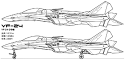 In the mid 2050’s the New UN Spacy had established a system of duty in which manned variable fighters like the VF-171 Nightmare Plus would sortie along with unmanned aerospace craft like the QF-4000 Ghost series. This created a problem for the successor unit to the VF-171 when in 2055 there was a strong sentiment that aerospace forces of the future would deploy unmanned craft for the main fighter role. However, by the end of 2057, Shinsei Industry submitted and demonstrated the YF-24 Evolution. The original YF-24 was cancelled during development and Shinsei Industry decided to pursue original development of a variable fighter with a focus upon the Inertia Store Converter (ISC) technology. Thus, the YF-24 Evolution was built with an airframe that contained a new ISC for which the prototype was called the “Camel” due to the prominent dorsal bulge needed to accommodate the large system. The YF-24 Evolution became a high-performance fighter which introduced various new technologies in addition to the revolutionary ISC system.