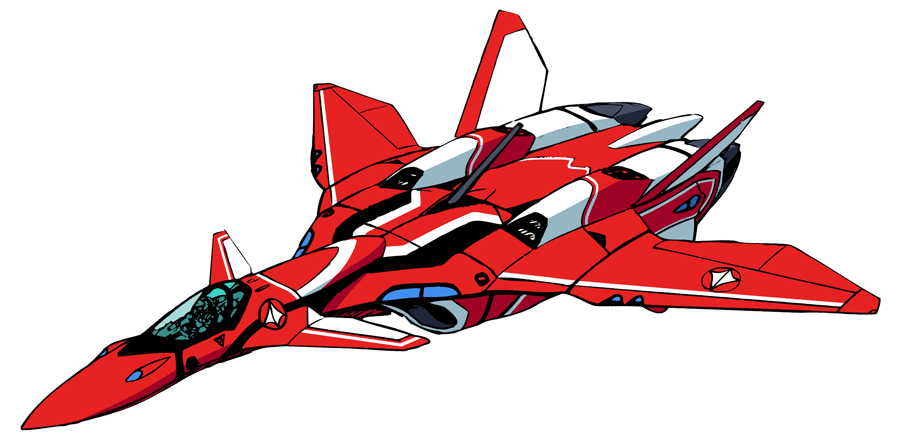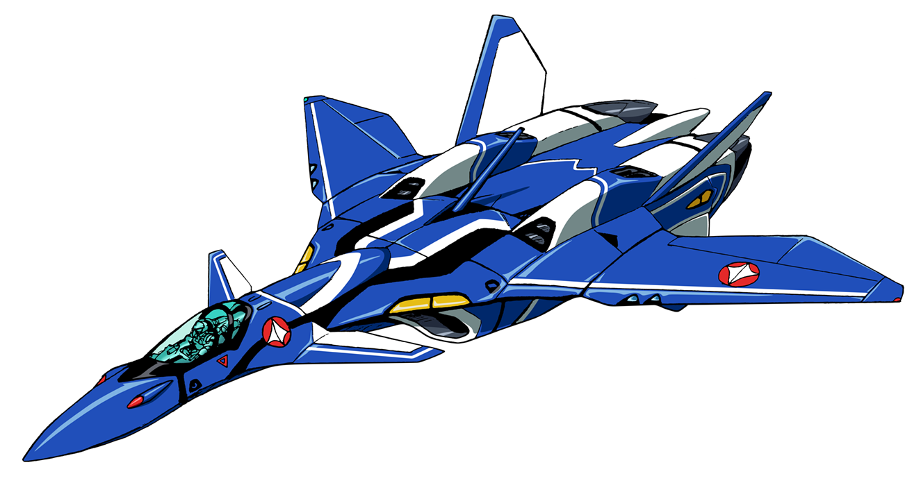 Design Features: 3-mode variable transformation; variable geometry sweep (VG) wing; canard forward wing; vertical Take-off and landing (VTOL); supersonic cruise and maneuvering in region of Mach 3.5+ below the stratosphere; two-dimensional thrust vectoring; improved waist joint system; anti-projectile (bulletproof) shield; retractable two-piece canopy cover (for Battroid mode); head-turret-mounted main sensor system and rear camera; 4 x conformal sensors (mounted within the main airframe's forward edge, behind canard wings, just above the air intakes); 4 x special equipment hard point stations for external Shinsei Industry space Super Part units; option of two solid-fuel rocket boosters; option of radome