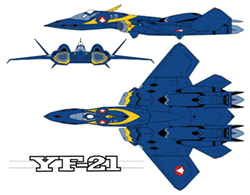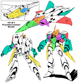 The YF-21 was built with several technologies common to itself and the competing YF-19 from Shinsei Industries; notably an active stealth system, an optional fold booster for interstellar travel and arm-mounted anti-projectile shields (doubling as tail stabilizers in fighter mode). Both variable fighters also employed a new fighter-scale pin-point barrier system, which produced movable spheres of super dimension energy upon the exterior hull of the craft for repelling incoming fire. Zentradi Technology was also implemented in the YF-21 Battroid mode by adopting an enhanced version of the Quimeliquola Queadluun-Rau special inertia vector control system (the YF-21 shares a similar silhouette to that Zentradi mecha). The offensive weaponry of the YF-21 includes a rearward firing super-miniature anti-aircraft laser turret, two forward/rearward laser beam guns, four internal all-environ rapid-fire micro-missile launchers and lastly two Howard/General GV-17L cartridge-less Gatling gun pods featuring retractable grips and stealth covers. In test sorties the YF-21 achieved performance results far beyond last generation variable fighters and the BDS/BDI system was clearly a recognizable improvement over conventional control systems. The YF-21 made use of variable wing cant for incredible speed and, like the YF-19, could achieve satellite orbit unassisted. While most VFs have traditionally situated the main engines within the legs of the Battroid, the YF-21 arranged the engine block in the main body with independent legs. By discarding the mostly dead weight of the arms and legs, the limiter-release mode can attain performance reaching the fuselage design limits and attain high manueverability combat performance exceeding other VFs. However, the pilot operating the limit-release mode bears the effect of dangerous G-forces which exceed the limits of the human body. While the YF-21 was a groundbreaking fighter, development of the craft was hindered by several misfortunes and technologies of questionable practical worth that were either unreliable (BDI/BDS) or too expensive for mass production (composite material wing).