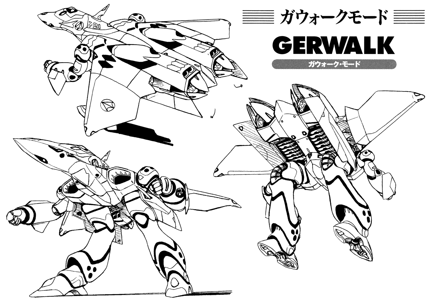 Design Features: 3-mode variable transformation; variable camber wing; enhanced version Quimeliquola Queadluun-Rau special inertia vector control system; two flight configuration modes (cruise and high speed) achieved via varying the cant of wing/tail surfaces; vertical take-off and landing (VTOL); supersonic cruise and maneuvering in region of Mach 5.0+ below the stratosphere; three-dimensional thrust vectoring with three exhaust nozzle flaps on each engine (independent pivot); capable of attaining unassisted orbital velocity over an Earth-class planet; brainwave control system (BDS); brain direct image system (BDI); 2 x arm shields/trapezoidal combined variable-cant tail stabilizing surfaces; internal launchers for micro-missile weaponry (central dorsal section); fighter-scale pin-point barrier system (PPB); active stealth system; transformation mechanism factors into high performance as shown in simulated combat against the YF-19; soles of the feet contain nozzles for VTOL for Battroid and GERWALK modes; 6 x multi-mode sensors (one on the top, one on the bottom and four on the sides of the nose); 1 x special equipment hard point station for optional 1 x Shinnakasu Industry/OTEC FBF-1000A external prototype fighter fold booster (not certified for performing folds beyond a one-way limit of 20 light years); optional 4 x all-environment FAST Pack weapon packs with micro-missiles (two mounted ventral fuselage in fighter mode, on leg storage bay cover panels in GERWALK/Battroid modes; two mounted on rear stabilizers in fighter mode, on lower arms in GERWALK/Battroid mode); composite material wing (alters wing shape/size)