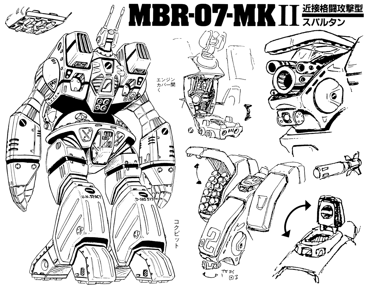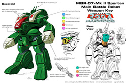 The MBR-07 Destroid Spartan was born as a humanoid-type weapon from the UN Forces ambulatory weapons program. Designed for close hand-to-hand combat, the Spartan was the second-place participant of the ambulatory weaponry competition. Development of the MBR-07 followed one year and two months after the first MBR-04 series destroids began design in 2003. The Spartan then entered trial production in February 2005 and by January 2008 Mk I units were beginning first rollout. All Mk I units were later upgraded into Mk II units.