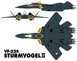 Description: Gamlin Kizaki of the UN Spacy forces operated a VF-22S Sturmvogel II as part of his service aboard the Macross 7 colonization fleet in 2047. When brash singer and war hero Nekki Basara left the fleet, Gamlin and the UN Forces tried to discover where Basara had gone. Sometime later, the Macross 7 fleet detected Basara's sound energy coming from the planet Zola and Gamlin was sent to investigate. Piloting a dark cyan colored VF-22S, Gamlin soon became embroiled in the events surrounding the space whale migration taking place in orbit. With the assistance of the Zolan military, Gamlin engaged a large number of pirate forces in combat. The powerful VF-22S, operated with speed and grace by the highly skilled Gamlin, proved an unbeatable force in battle against the enemy pirate forces.