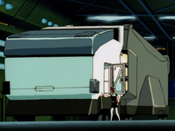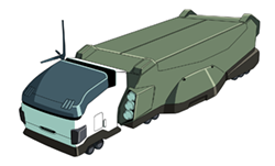 The Tractor Trailer Type Shuttle is a very large fourteen-wheel cargo transport vehicle commonly available for rent aboard colonization fleets. The shuttle is designed to operate for limited, short-range travel in space, typically around a City Class ship. The shuttle has several banks of thrusters built into the front, sides and underside of the forward cabin and rear cargo sections to allow maneuvering in a vacuum. An enclosed life support system protects the occupants. These systems make the shuttle "Milky Road-worthy" (airtight) so it can leave City 7 and navigate the large web of guidance beams permitting safe space travel between the many vessels of the Macross 7 fleet. The cabin can hold 5-6 people. A Tractor Trailer Type Shuttle was used to transport Basara and the Fire Bomber band (along with the VF-19 Custom Battroid) and was damaged by an enemy Fz-109 Elgerzorene during their show aboard the Three Star Factory Ship (Macross Chronicle 2E Macross 7 Mechanic Sheet Citizen 03A).