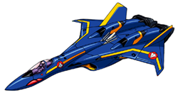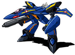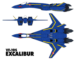 With each new class of variable fighter the UN Spacy has found it useful to assign modified variants to team leaders and flight commanders. The VF-19S is a variant built in line with that official doctrine and features several improvements from the standard Excalibur model. A new head unit was built to replace the standard "F" series model, but in addition to the standard central beam gun the VF-19S features four additional fixed anti-aircraft laser cannons mounted on the sides of the head turret. The VF-19S weighs slightly more than the standard model Excalibur (8.62 metric tons) but more than offsets the little additional weight with significantly improved engines. Two Shinsei Industry/P&W/Roice FF-2550J engines provide the VF-19S with 12,900 kg [x g] more thrust. The VF-19S, like the VF-19F, appears in standard blue mass production colors but the "S" model includes gold highlights unlike the "F" model silver highlights. Second Lieutenant Docker of Emerald Force was noted for flying a VF-19S during the Protodeviln War in 2045-2046.