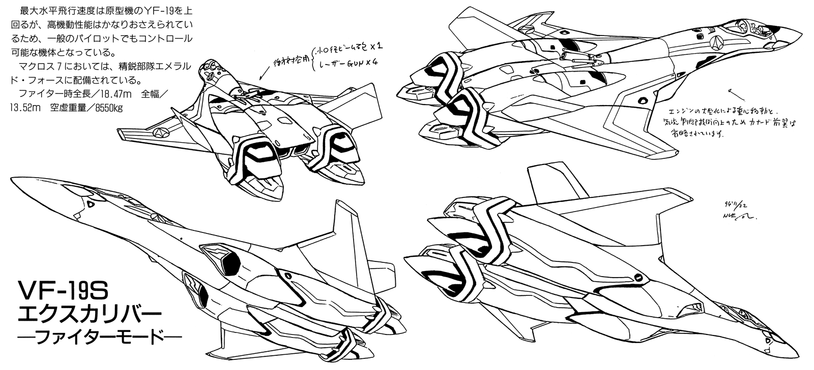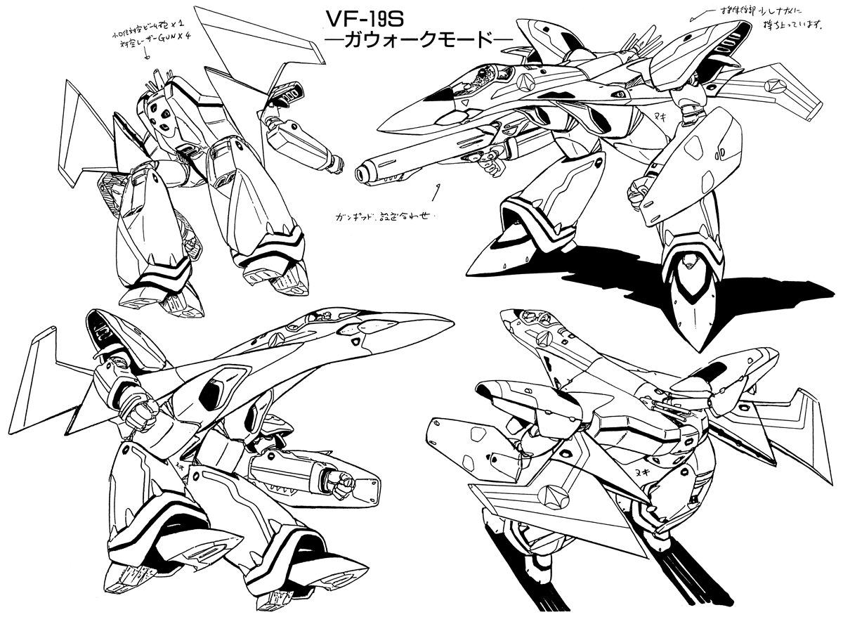 Design Features: 3-mode variable transformation; forward-swept delta-wing combination main wing (VF-19F, VF-19S); variable geometry sweep (VG) wing; vertical take-off and landing (VTOL); supersonic cruise and maneuvering in region of Mach 5.0+ below the stratosphere; two-dimensional thrust vectoring (independent pivot); capable of attaining unassisted orbital velocity over an Earth-class planet; wrap-around imaging monitor system in cockpit (all modes); anti-projectile (bulletproof) shield; internal weapons bays with medium-range high maneuverability missiles (engine/leg sections); fighter-scale pin-point barrier system (allows for armor simplification and light weight); active stealth system; 3 x special equipment hard point stations for optional 2 x space/atmospheric conformal propellant tanks and optional 1 x space/atmospheric fighter fold booster; strengthened communications and armaments