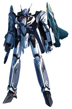 - docked upon left/right main wings of VF-31F Siegfried in Fighter mode (VF-31F Siegfried main wings fold vertically to accommodate), mounted rear torso in Battroid mode