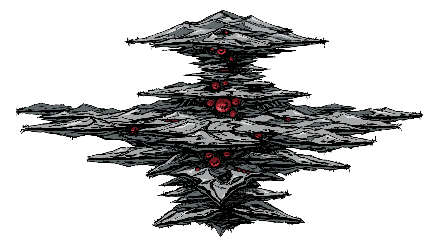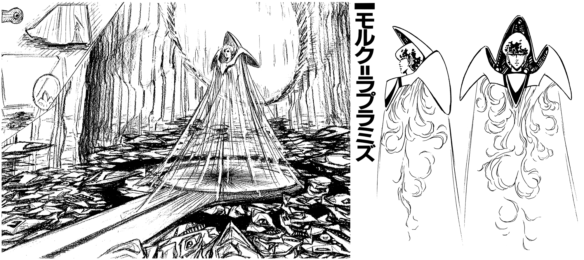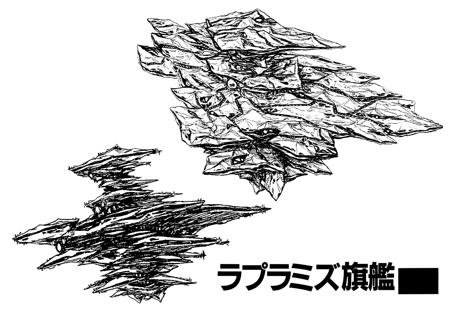 The Meltrandi Laplamiz-Class Mobile Fortress was seen only briefly near the end of Space War I. This immense spacecraft, comparable in size to the Zentradi Gol Boddole Zer Class Mobile Fortress, served as the mothership for the Laplamiz Meltrandi fleet. The mobile fortress appears in a stark grey color with a hull design that looks almost rock-like, resembling a multi-tiered mountain range. The Laplamiz class is far beyond the size of the largest Meltran spaceships and within it's hull the mothership can berth numerous other craft for fueling and supply. The Mobile Fortress is commanded by Moruk Laplamiz, an ultra-large holographic computer manifested via an energy body composition with optical fiber-like strands connected to her head and shoulders. Like other mobile fortresses, the hull of the Meltrandi mobile fortress is a growing/self-building technology that automatically constructs new hull areas. The hull is a semi-organic structure with a laminated assembly that expands via the automatically constructed laminate. Unlike the Zentradi, the Meltrandi have a higher degree of dependence upon inorganic rather than organic technology (Macross Chronicle 2E DYRL Extra Report Character Sheet Meltrandi 01A: Milia 639).