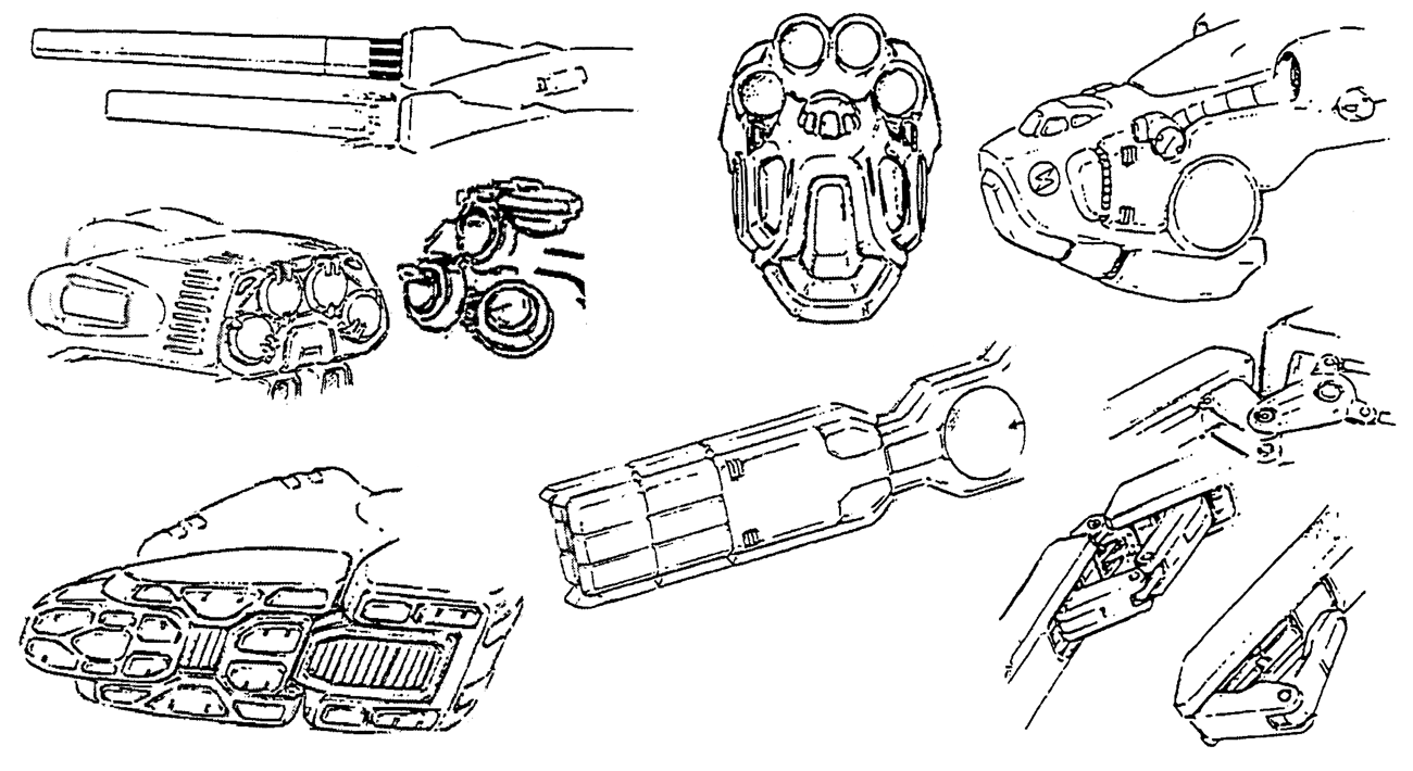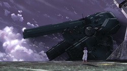 4 x Viggers 40cm liquid-cooled, liquid propellant cannons with a 160 kilometer range (mounted on top); fire control system links to interlocking surveillance satellites "Eye of God" for average error of impact less that 10 meters; OTM materials in the barrel improve strength significantly and extends the long-range distance and improves rate-of-fire performance