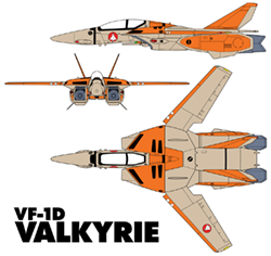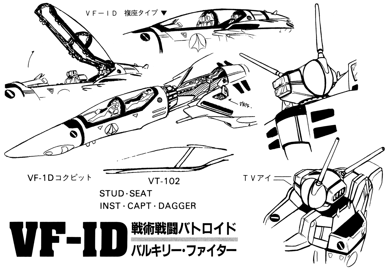 A variant to the standard VF-1 Valkyrie, the variable fighter "D" is a two-seater version that features two TV camera "eye" systems within the head unit and slightly upgraded firepower via a second Mauler RÖV-20 anti-aircraft laser cannon. Manufactured by the VF-1 designer Stonewell and Bellcom, the VF-1D ironically saw the fewest compliment of the main four VF-1 variants aboard the SDF-1 Macross, but nonetheless was an active-service variable fighter. A number of VF-1D units were also deployed as advanced training variable fighters, for live weapons and full combat functionality instruction. A VF-1D unit designated VT-102 was one such example with the label